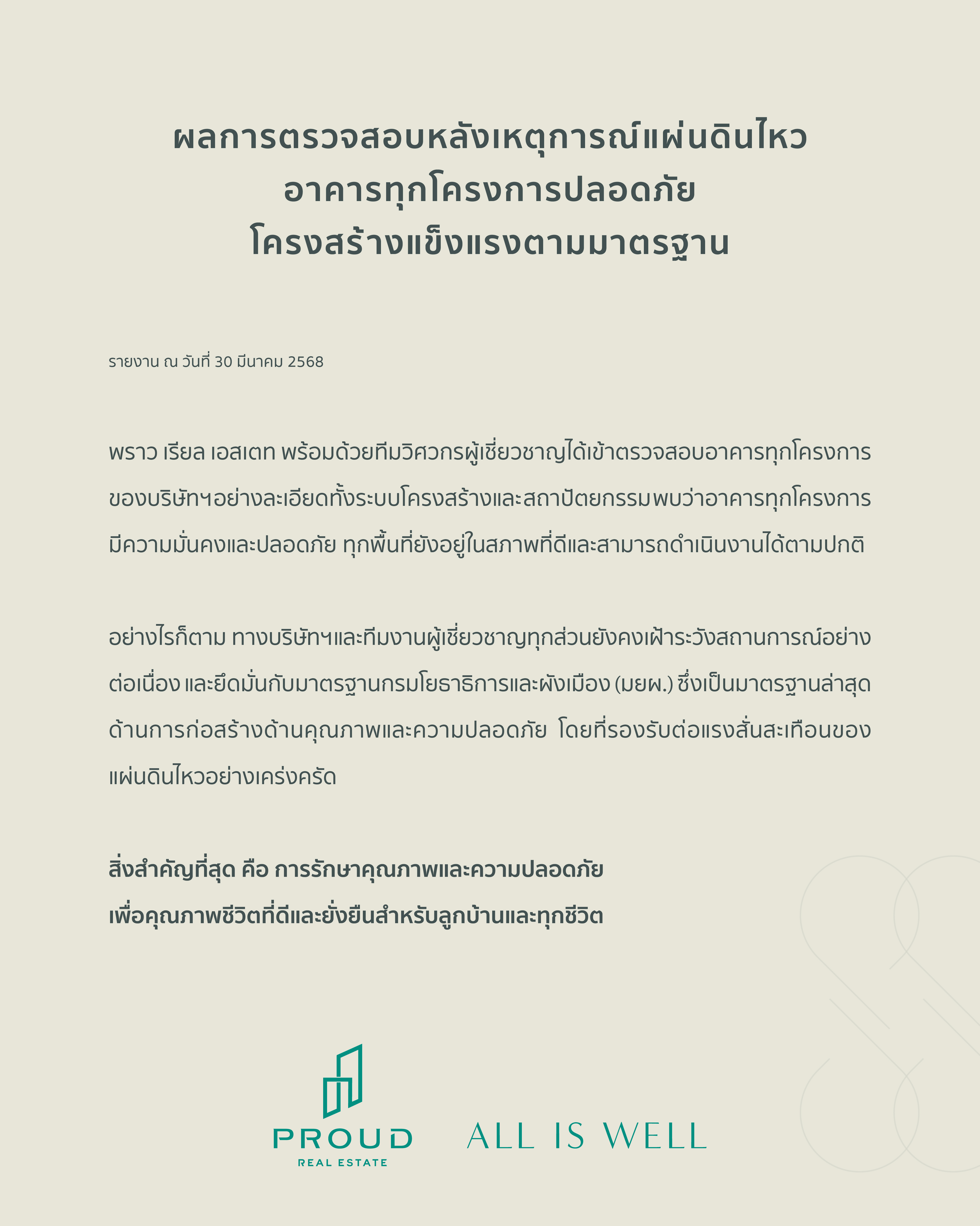 พราว เรียล เอสเตท แจ้งความคืบหน้าจากการตรวจสอบโครงการ หลังเกิดเหตุแผ่นดินไหว เพื่อความปลอดภัยของทุกท่าน